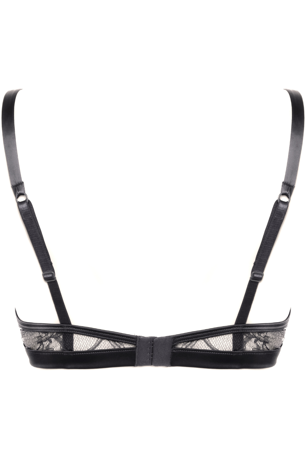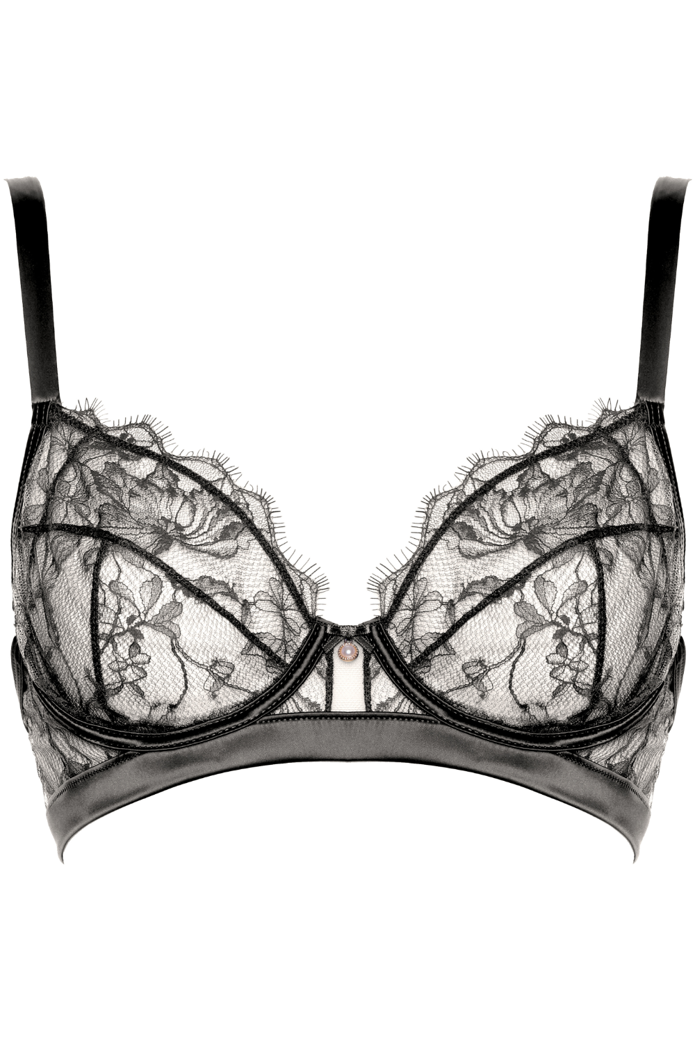 Black Pearl Full Cup Bra with underwired 3-part cups in Italian floral lace and satin. Luxurious, supportive, and elegantly crafted for timeless allure.