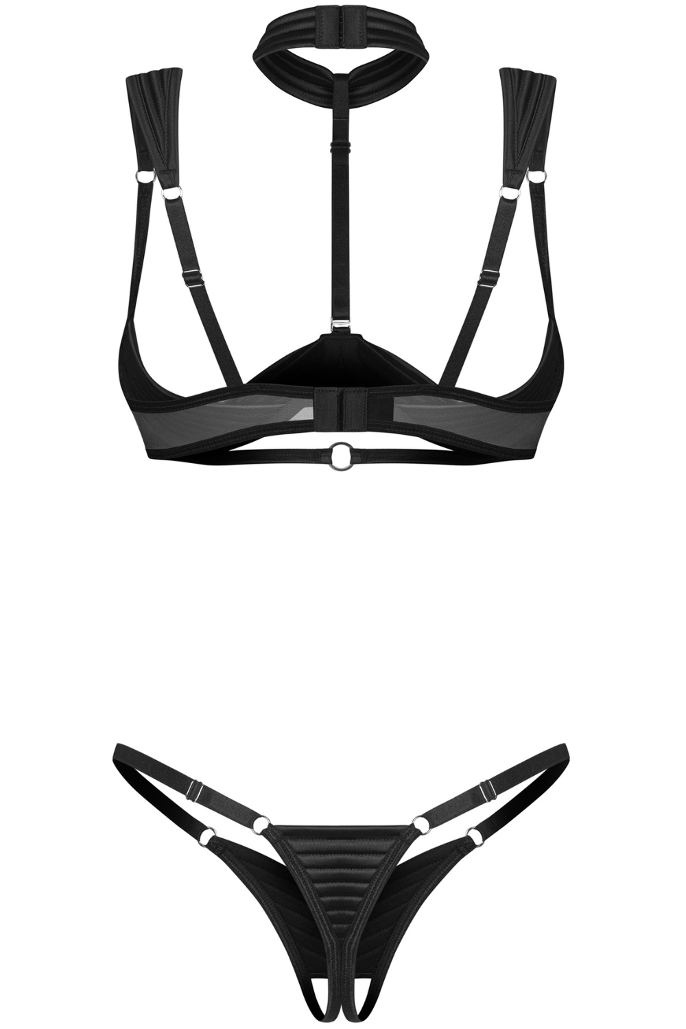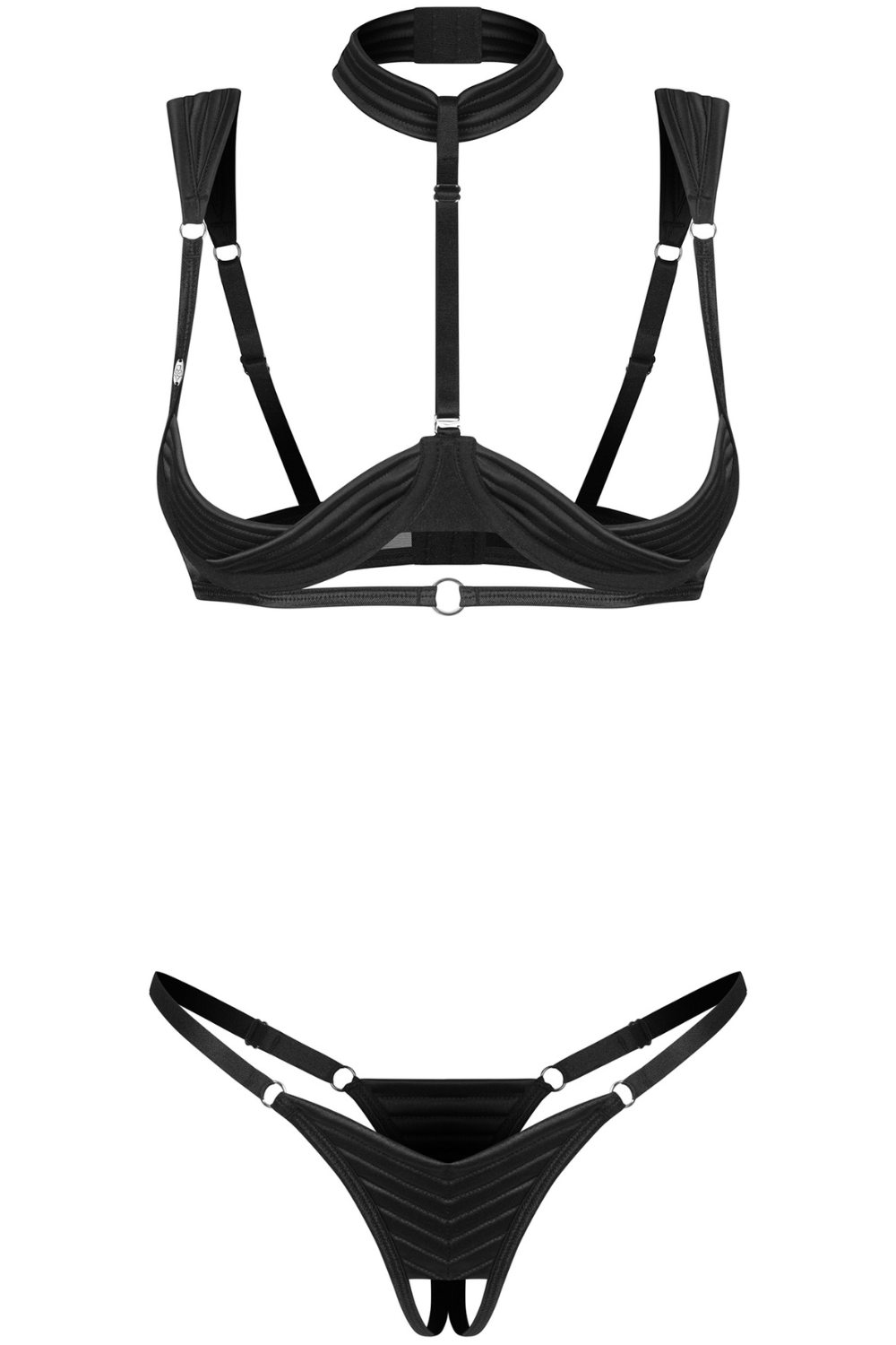 Bold black two-piece set featuring an open bra with lifting and an open-crotch thong. Choker detail adds edge, adjustable straps ensure perfect fit. Pure seduction.