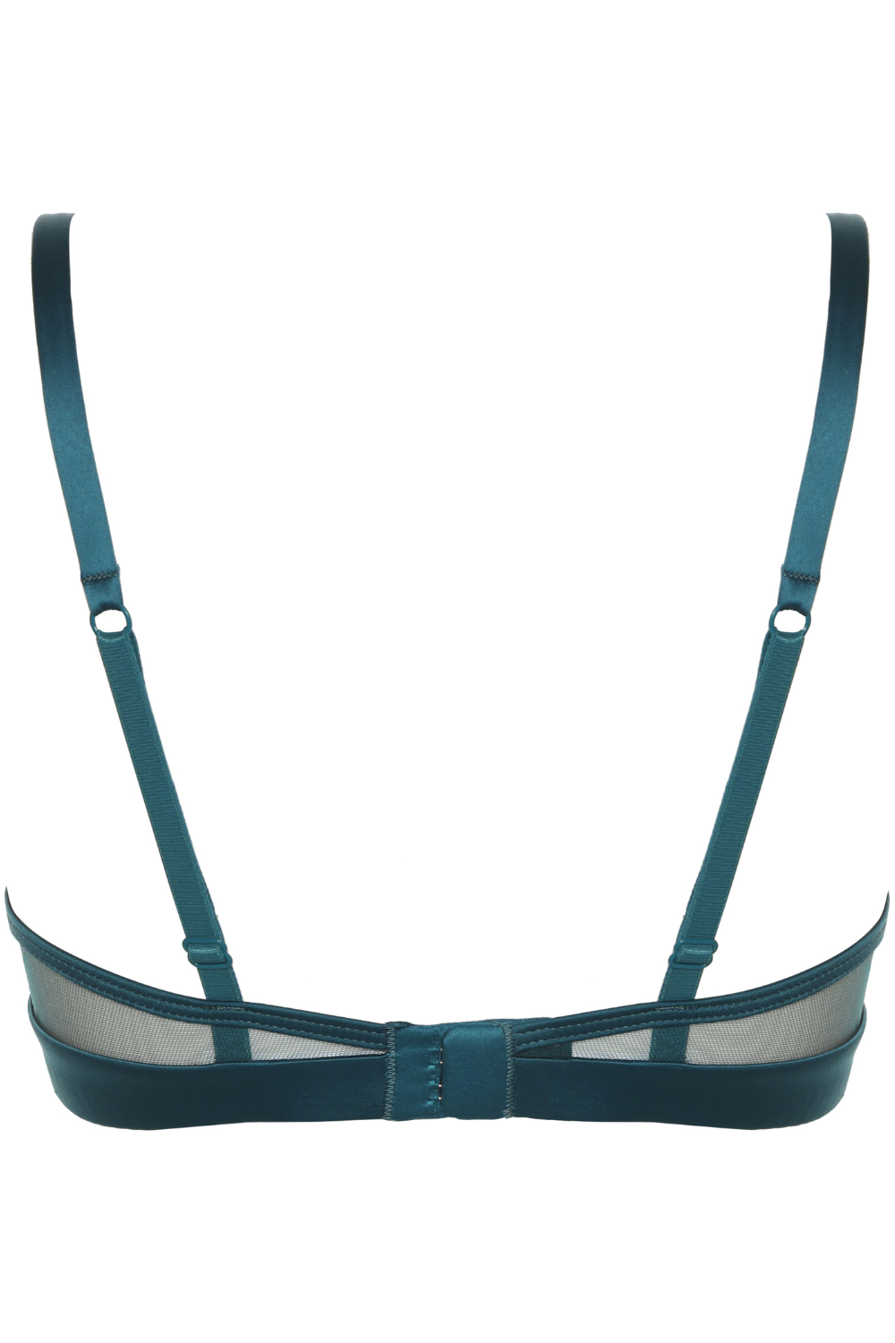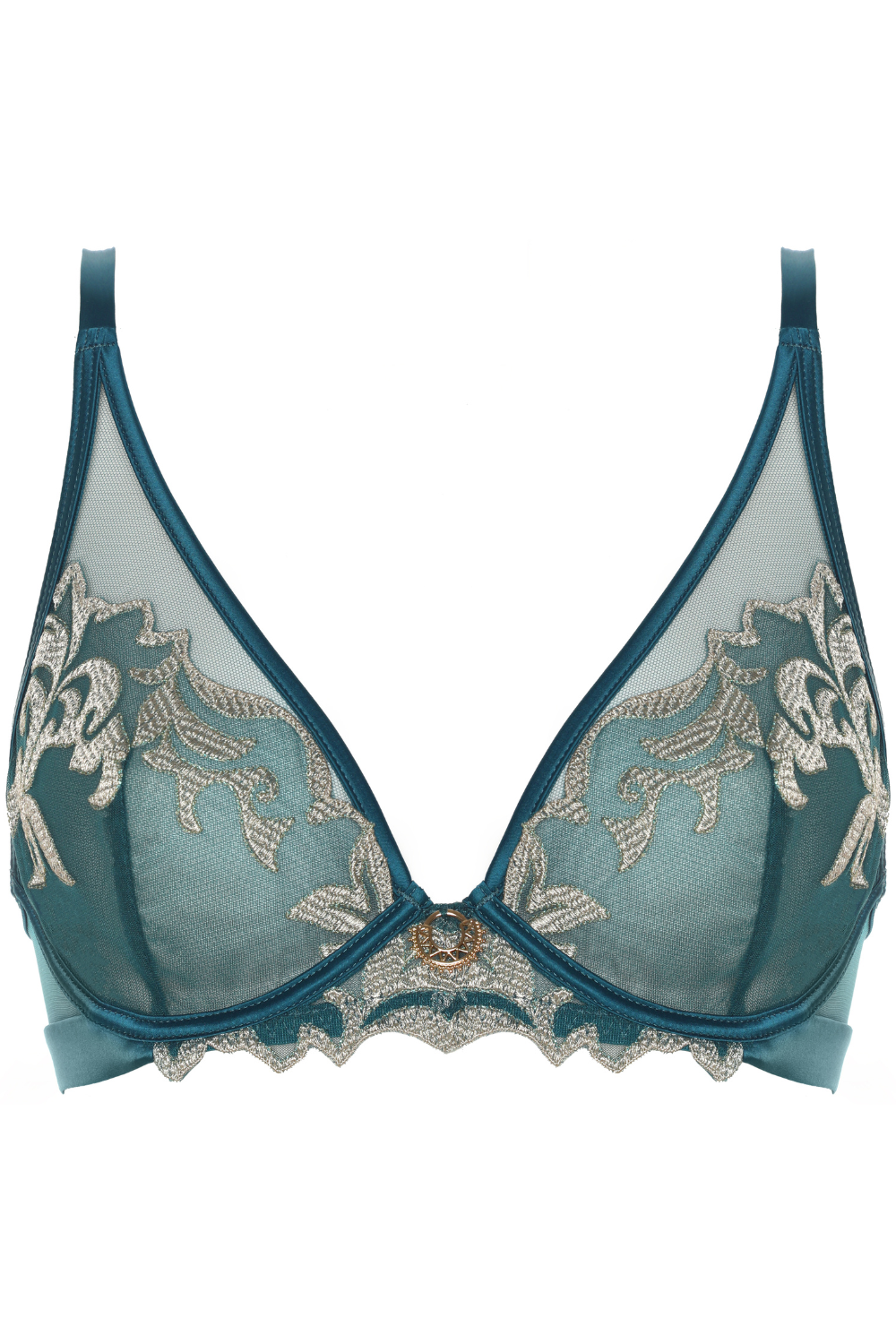 The Venus Triangle Plunge Bra in teal pairs delicate embroidered mesh with silky satin trims. Underwired cups offer lift and support while enhancing a deep, feminine neckline. An elegant, art-inspired design with a light, sculpting feel.