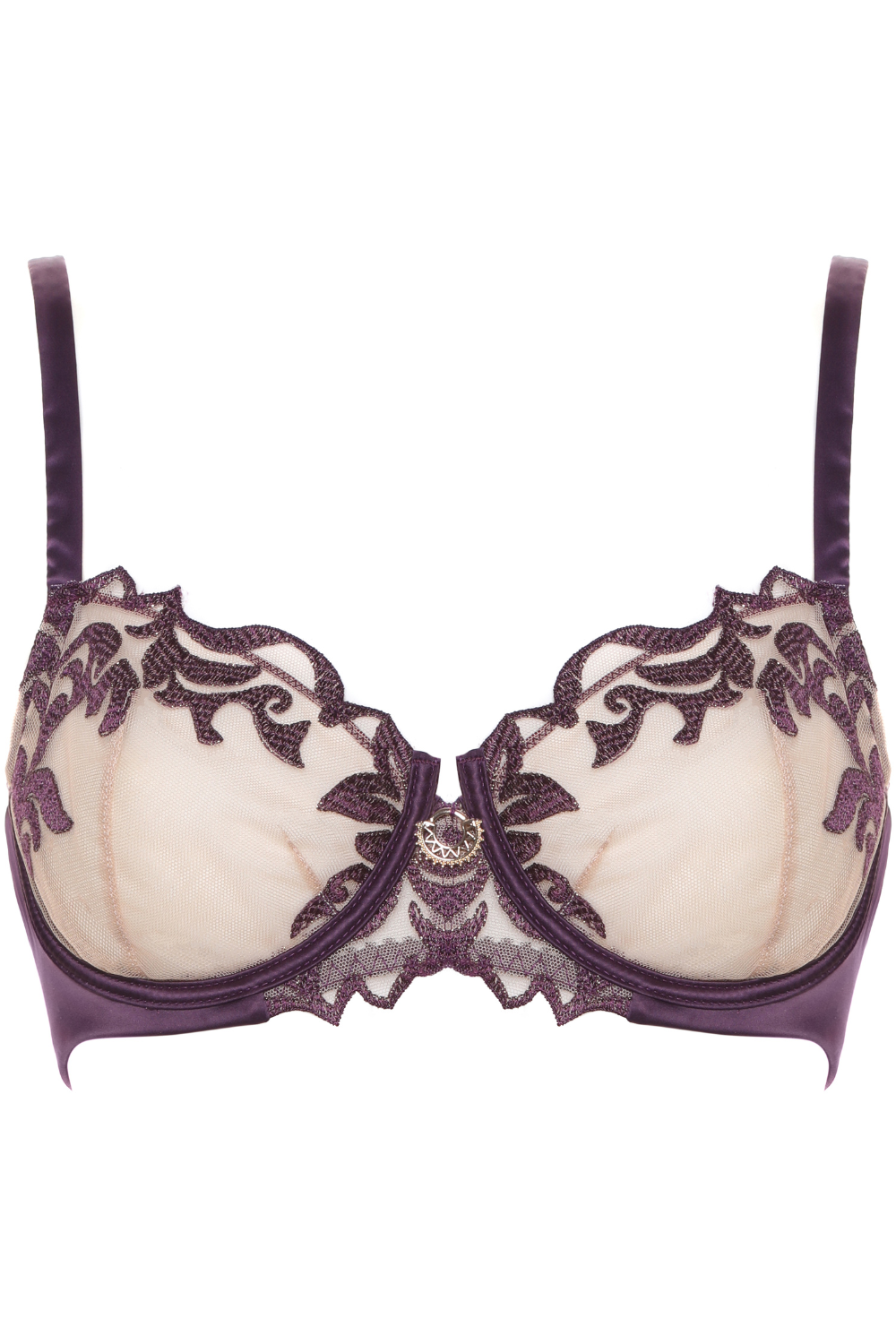 The Venus Balcony Bra in violet pairs intricate embroidered mesh with silky satin trims and back. Underwired cups provide lift and structure, enhancing the bust with romantic, goddess-inspired sophistication.
