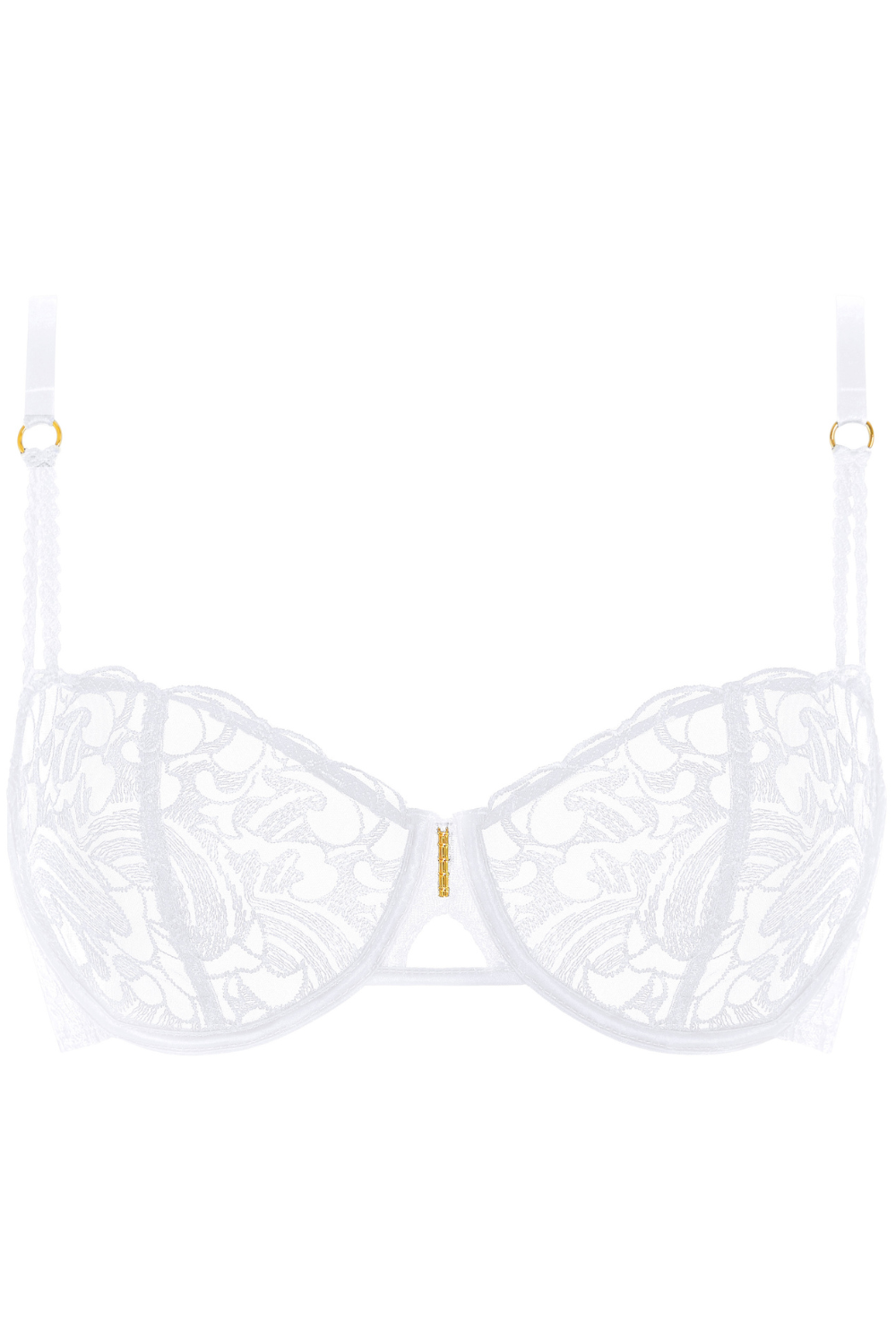 The Satin Memories Arctic Blue Half Cup Bra combines French embroidery with shimmering Italian satin for a luxurious, luminous effect. Underwired for natural lift, this demi-cup bra features wave-inspired embroidery, golden bamboo charms, and delicate guipure strap bands, offering elegance, comfort, and a touch of poetry in every detail.