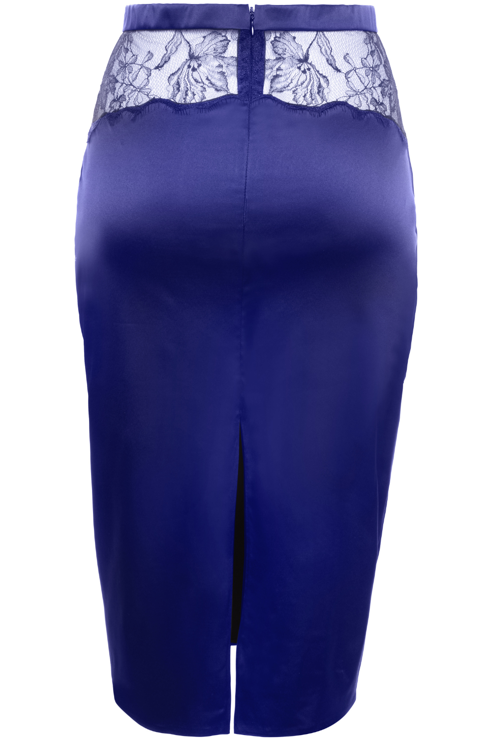 Royal Blue Pencil Skirt from Prelude's Pearl in silky satin with Italian lace front, back split, and centre-back zip. Sophisticated, flattering, and artfully detailed.