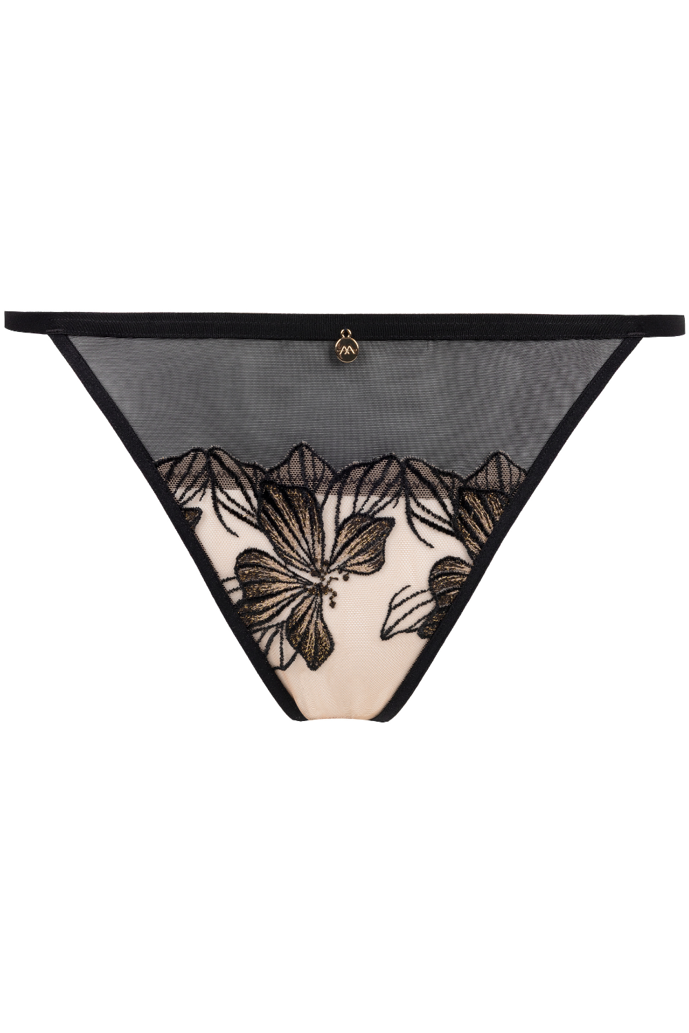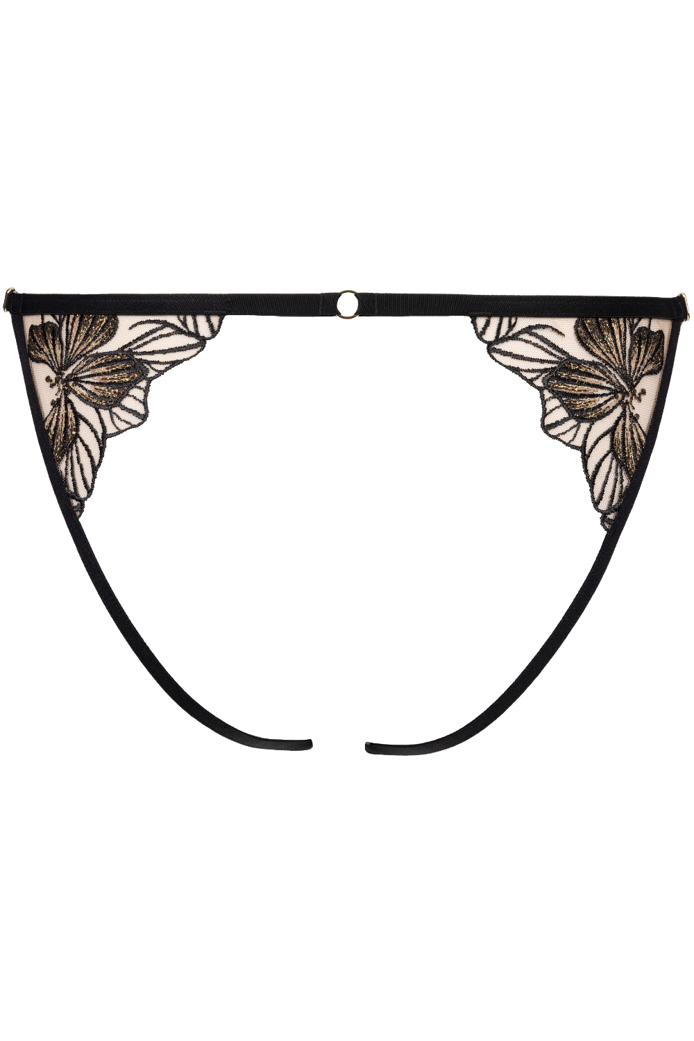 Fleur Défendue Open Brief by Atelier Amour combines audacious design with refined elegance. Featuring striking black and gold Art Deco-inspired floral embroidery on a nude base, this open-crotch brief frames the waist beautifully while celebrating your skin.