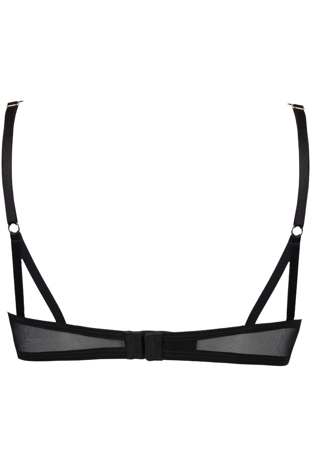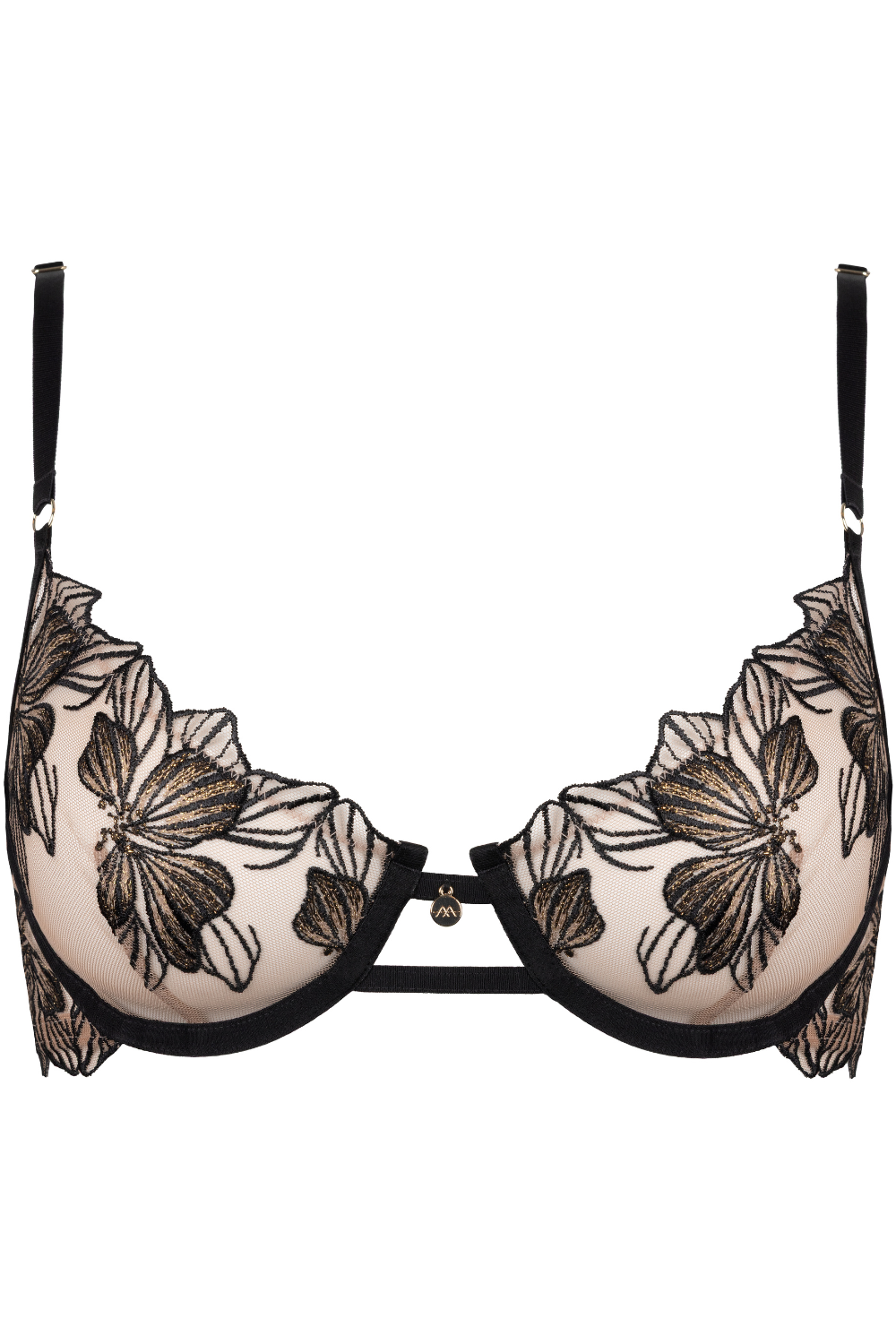 Delicately crafted from sheer tulle embroidered with golden floral motifs, this demi-cup style enhances the natural curve of the bust with underwired cups and a plunging V neckline.