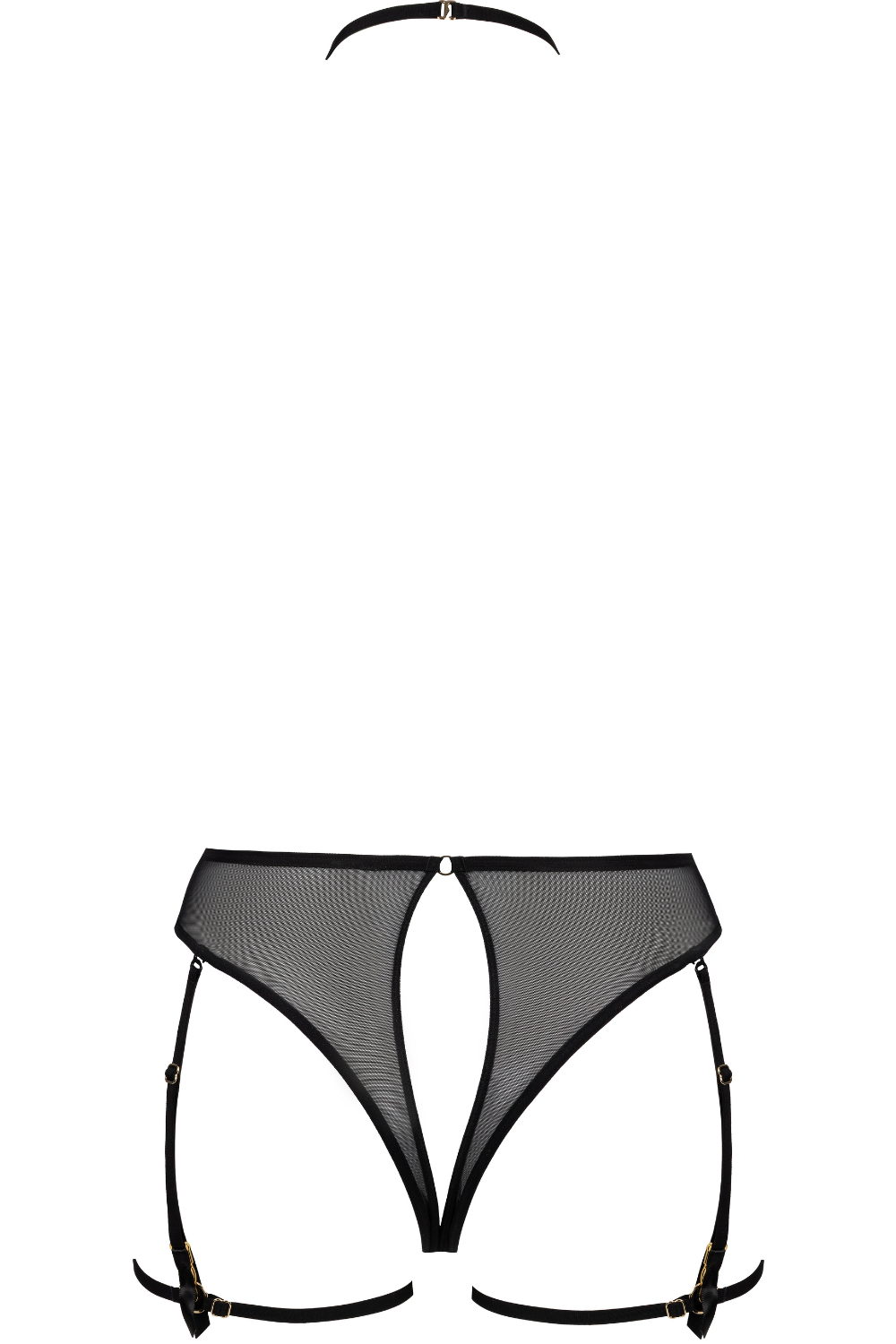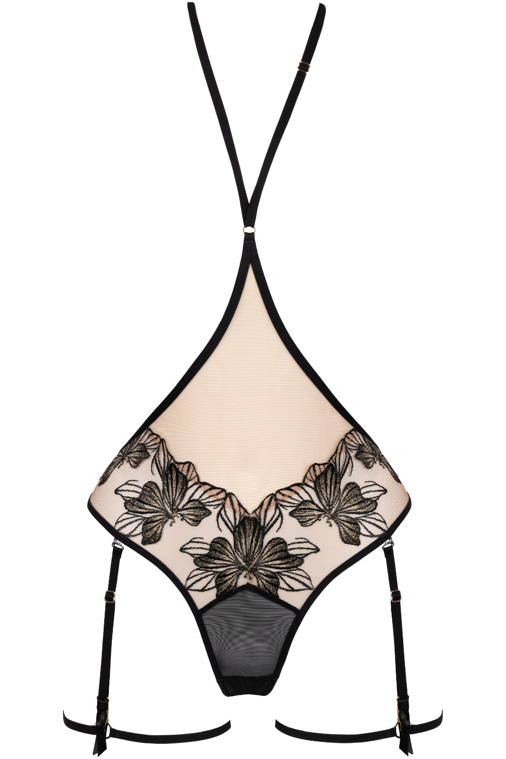 Experience the captivating charm of the Fleur Défendue Ouvert Harness by Atelier Amour—a stunning one-piece playsuit that exudes contemporary French elegance. Made from sheer mesh and embroidered tulle adorned with golden accents, it contours the body with exquisite detail. The bold ouvert back cut-out and removable garters offer versatile styling options, perfect for intimate evenings or refined boudoir attire.