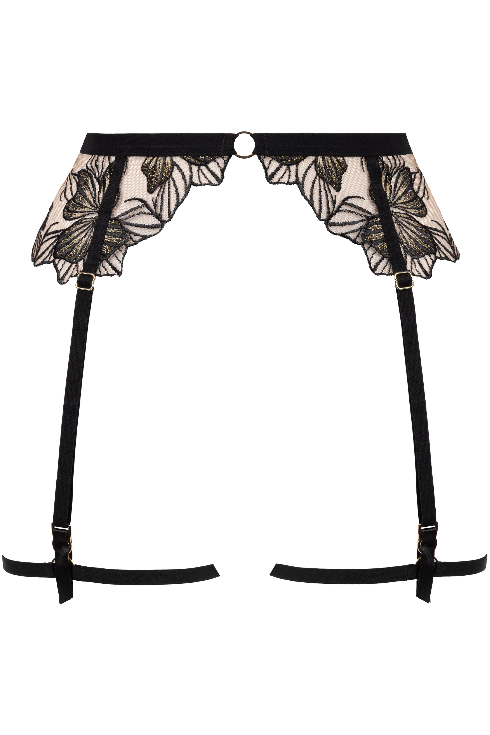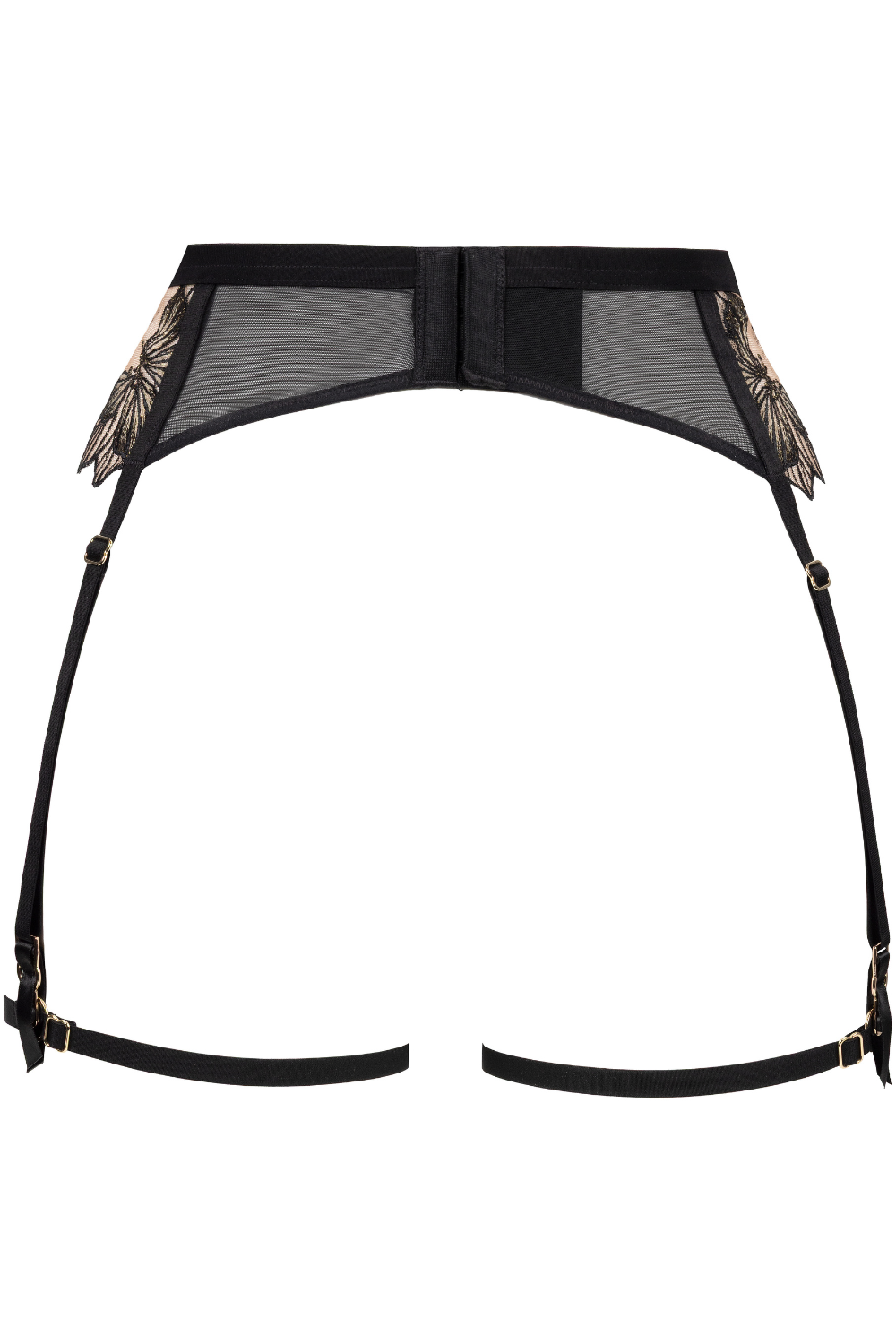 A breathtaking piece of French lingerie artistry, the Fleur Défendue Suspender Harness seduces with its delicate balance of femininity and power. Crafted from sheer tulle and adorned with golden floral embroidery, this exquisite suspender belt sculpts the waist while accentuating the curves of the hips.