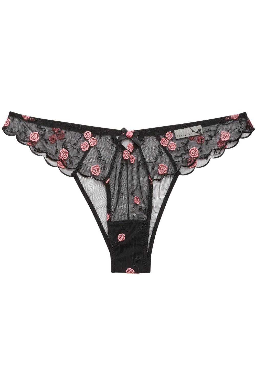Crafted from sheer tulle adorned with custom rose embroidery and the Fleur logo script, this brief features a silk rosette bow and flirty scalloped legline that flatter every curve. The sheer mesh back adds an alluring touch while maintaining a comfortable, barely-there feel — perfect for everyday wear or a romantic night in.