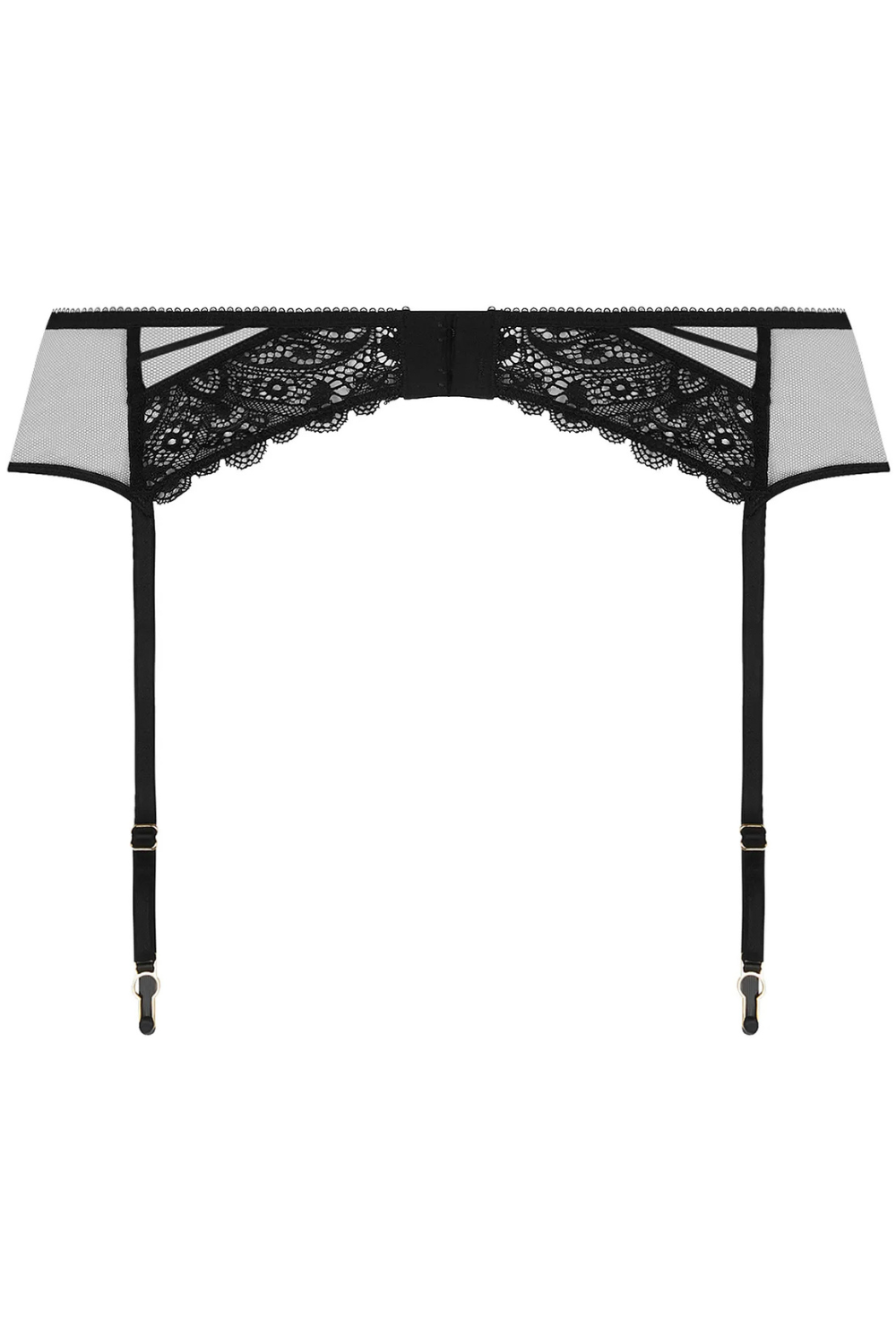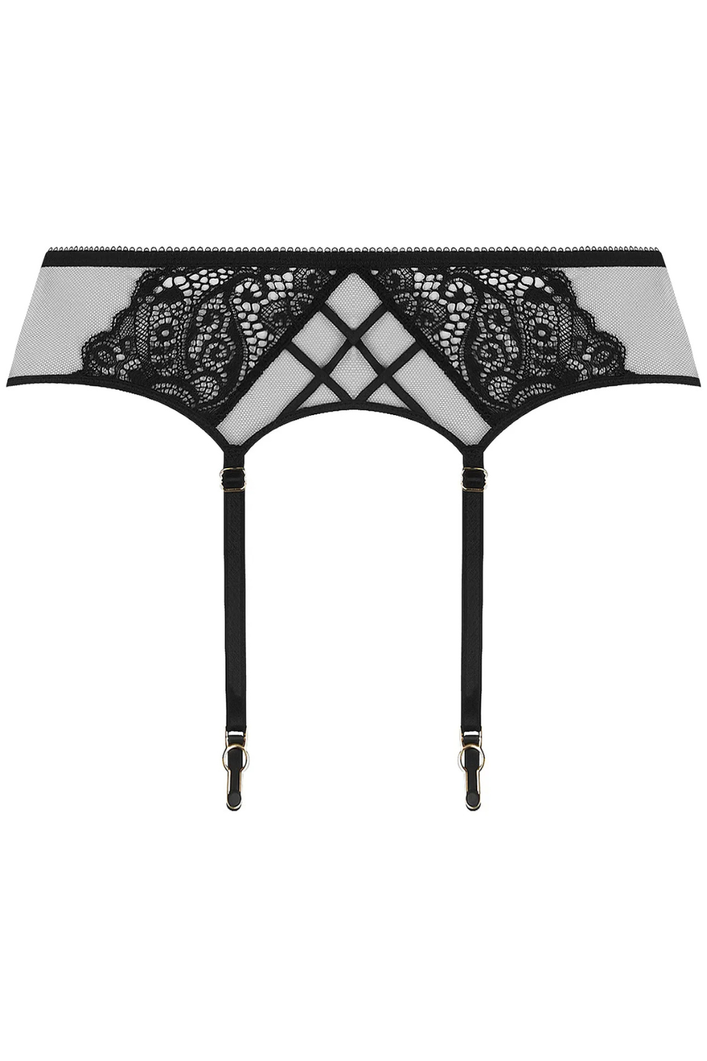 At the front, satin-finish elastic ribbons cross delicately across the body, drawing the eye to the waist and creating a striking, architectural effect. Refined lace softens the structure, while the back reveals a sheer interplay of tulle and lace, enhanced with coordinating ribbon details for a balanced, sculpted finish. Both sensual and supportive, this suspender belt is designed to hold stockings perfectly in place while elevating the entire look.