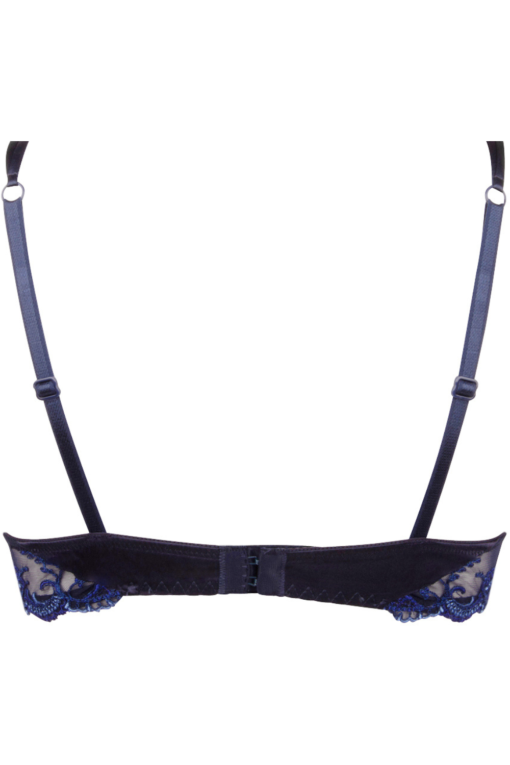 Crafted from luxurious Italian silk satin in a deep navy hue, it features sheer tulle panels and a delicately embroidered tulle underband that flatters the bust with a light, natural fit.