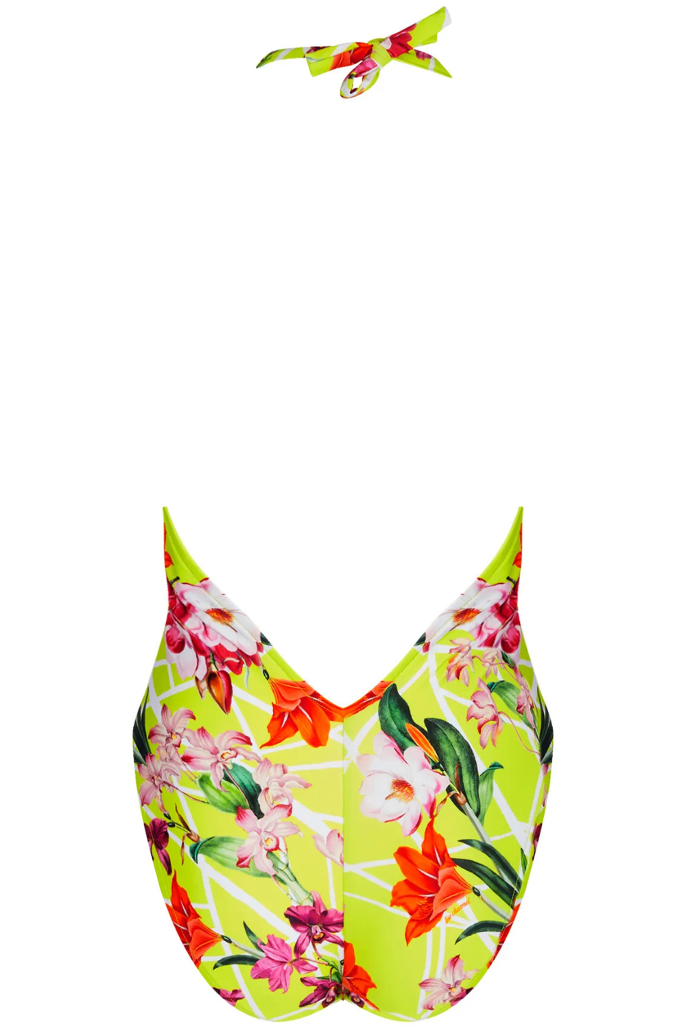 The Fleurs Splendeurs Seduction Halter Swimsuit in lime features an exclusive floral print with logo. The plunging front and open back create a bold, chic silhouette, enhanced by an adjustable necktie and a golden-leaf and jade-effect jewel. Soft, fully lined knit ensures comfort.