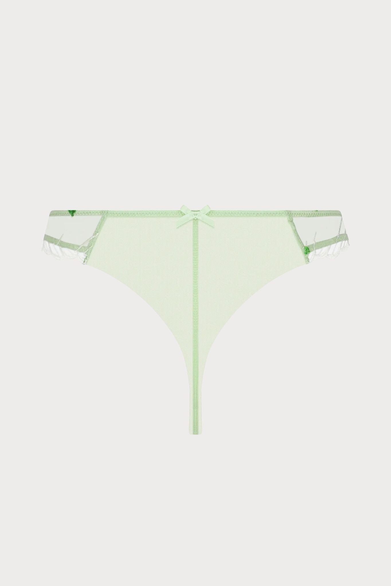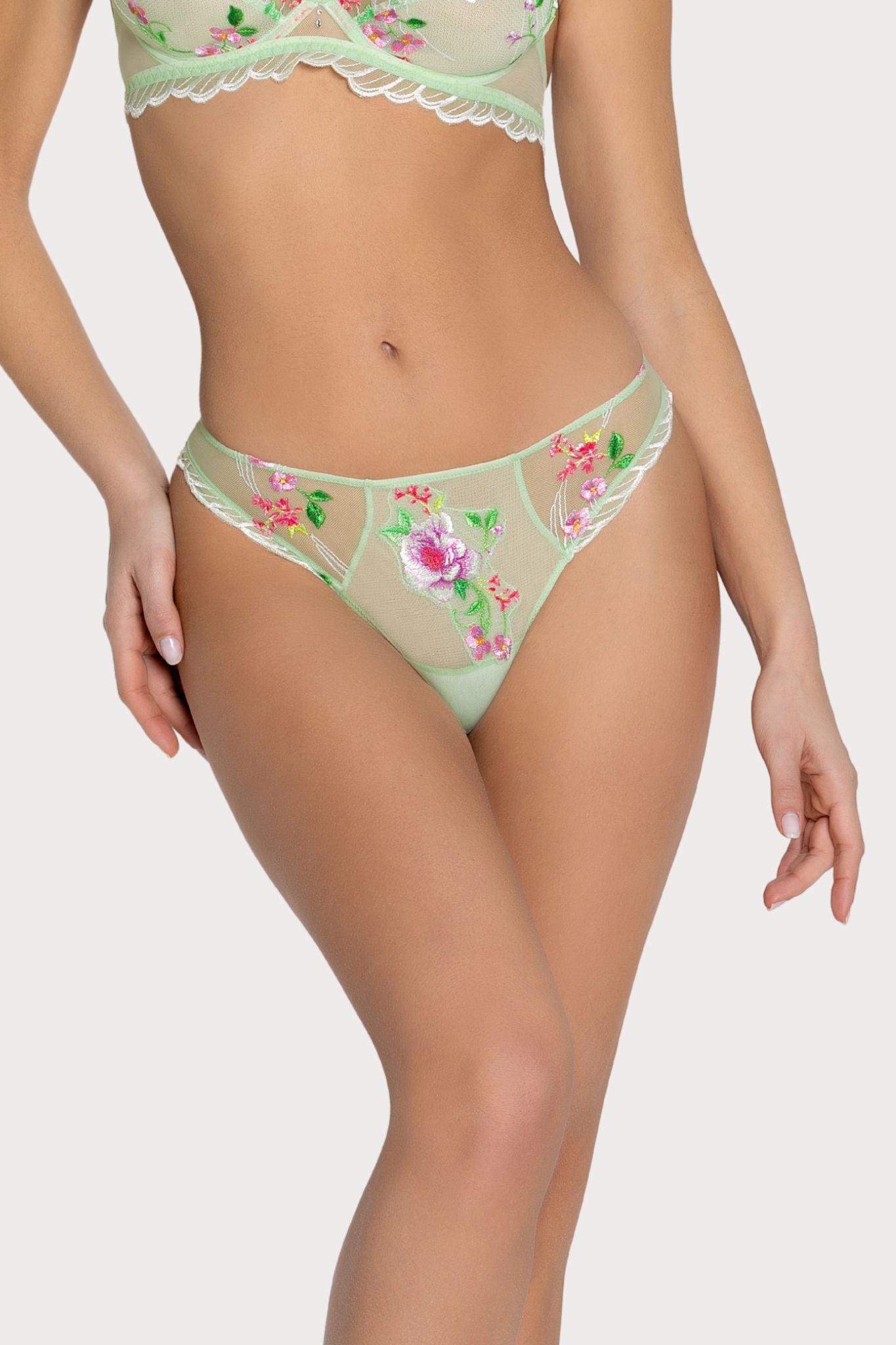 The front is pistachio tulle with a single floral motif in the printed embroidery. Embroidered panels at the hips are finished with scalloped edges. The back is plain pistachio mesh, with a small satin bow at the centre. Wear day to day with either the half-cup or the contour bra.