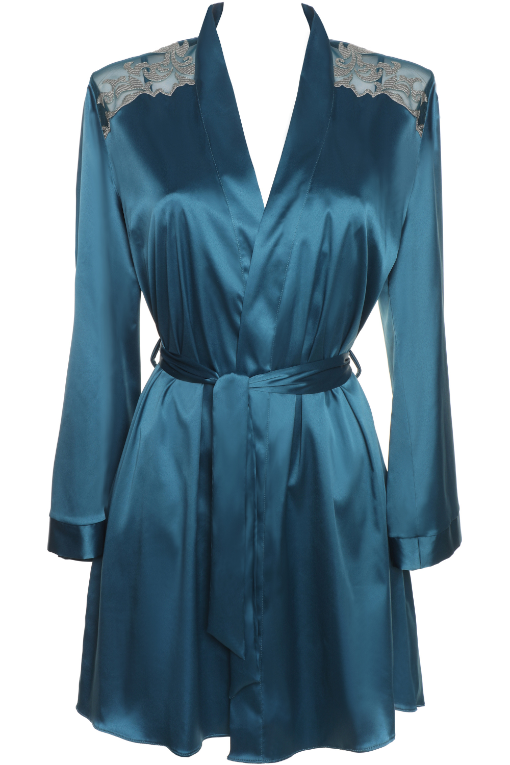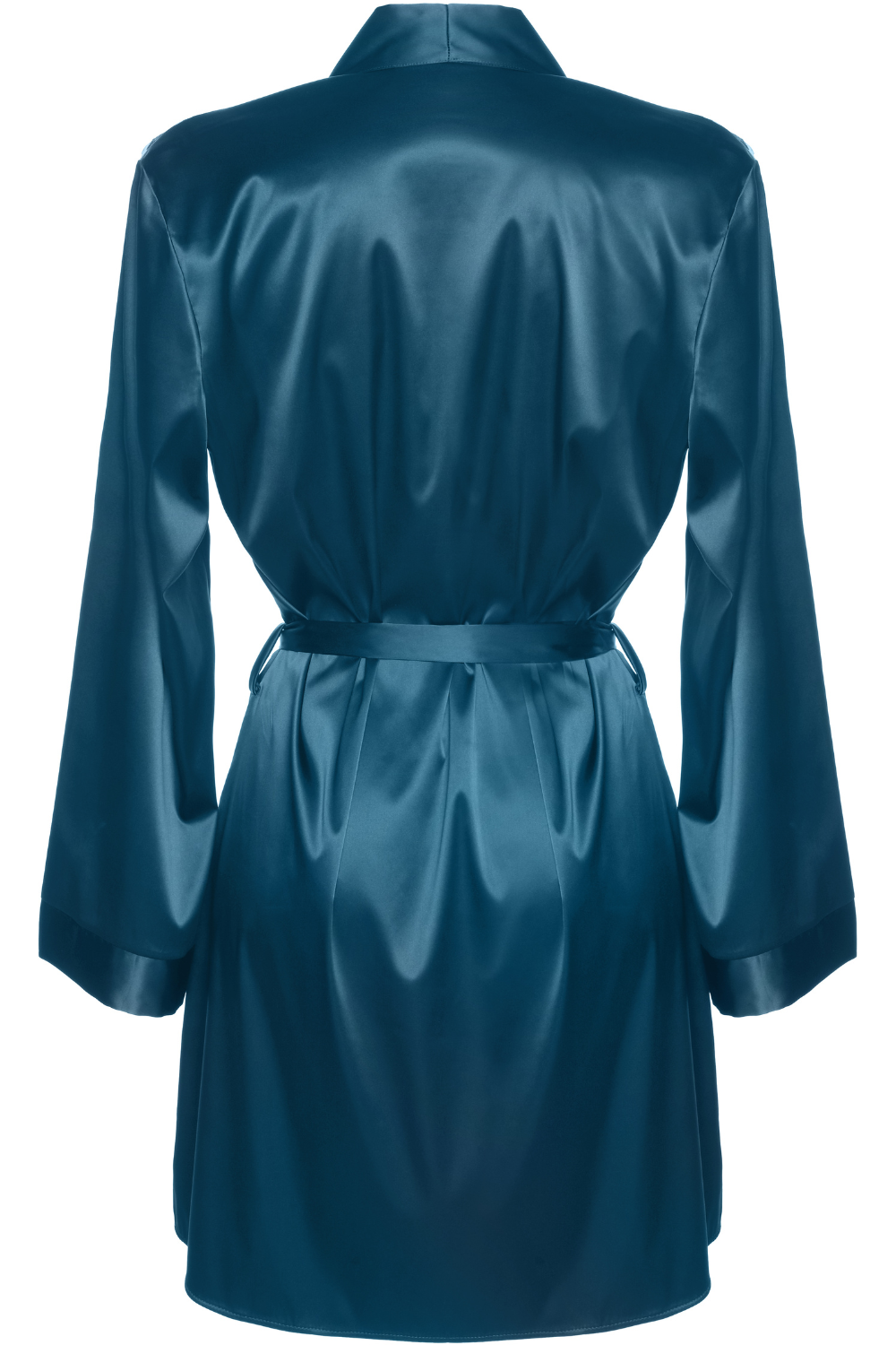The Venus teal Robe wraps the body in soft satin with flowing sleeves and delicate embroidery on the shoulders. Its short length and self-tie belt create a flattering, fluid silhouette inspired by oceanic elegance.