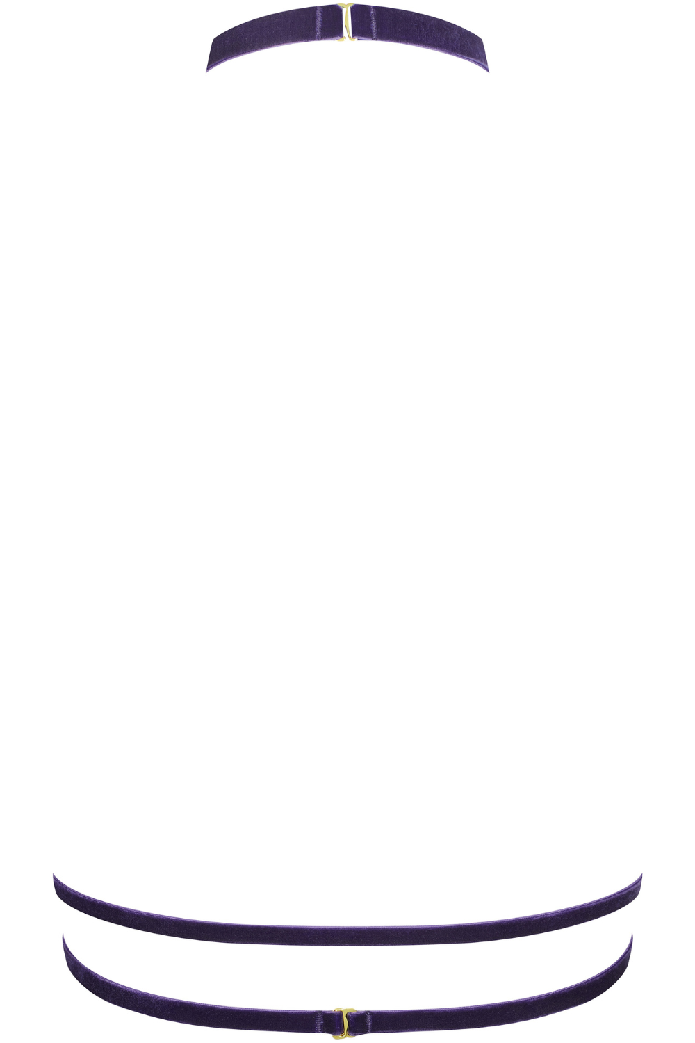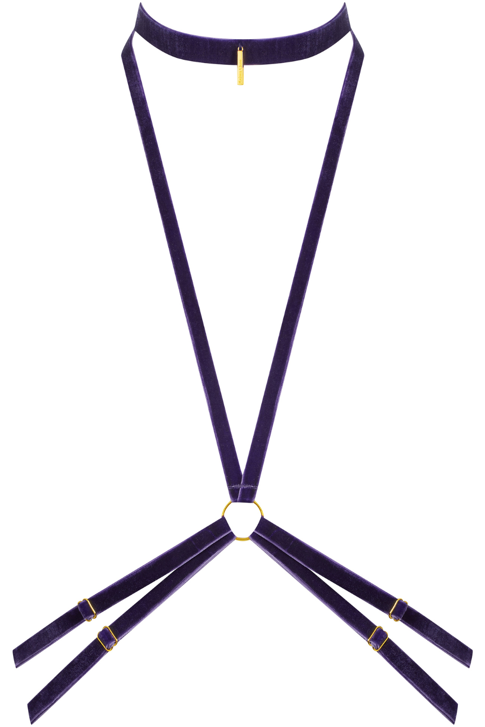 The Maison Close Les Fétiches Velvet Harness in purple evokes mystery and allure. Soft velvet straps embrace the body, while golden hardware brings opulent detail. Style with the matching open brief to create the illusion of a sexy open bodysuit.