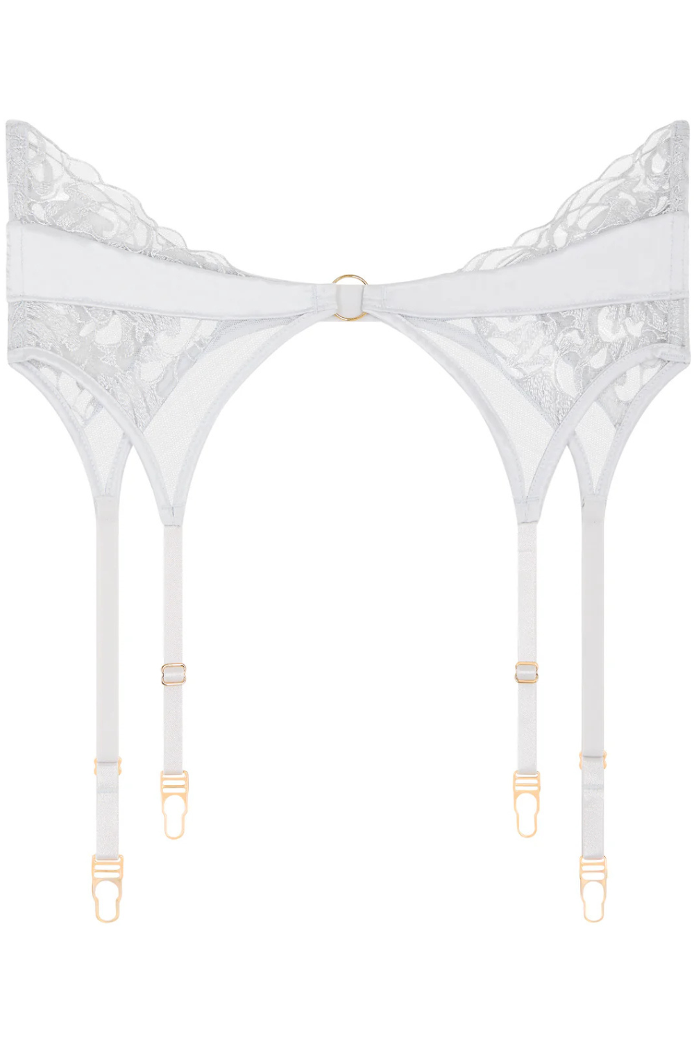 The Satin Memories Arctic Blue Waist Cincher elegantly sculpts the waist in soft tulle with wave-inspired French embroidery and shimmering Italian satin. Adjustable garter straps and golden bamboo charms enhance its sensuality, creating a luxurious, figure-flattering piece that embodies elegance and allure.