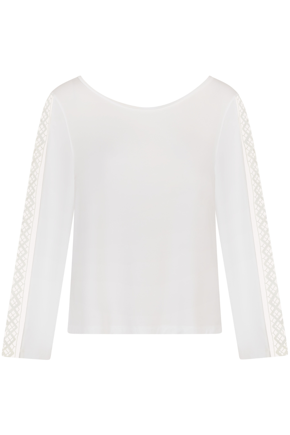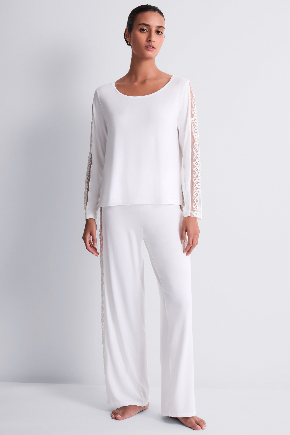 Aubade’s Sweet Obsession Long Sleeve Pyjama Top in ivory combines soft modal knit with sheer embroidered braid on the arms, long sleeves, and subtle side splits for a relaxed luxury feel.