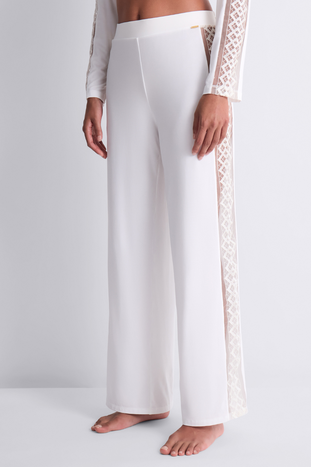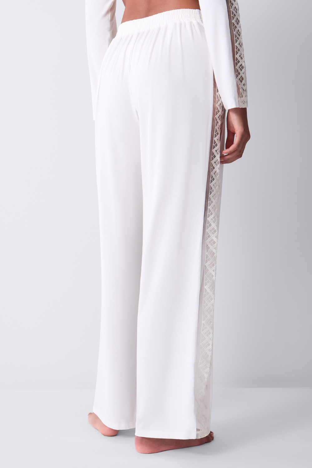 Aubade’s Sweet Obsession Trousers in ivory offer elegant comfort with soft modal fabric, embroidered leg panels, a wide-leg cut, and an elasticated back.