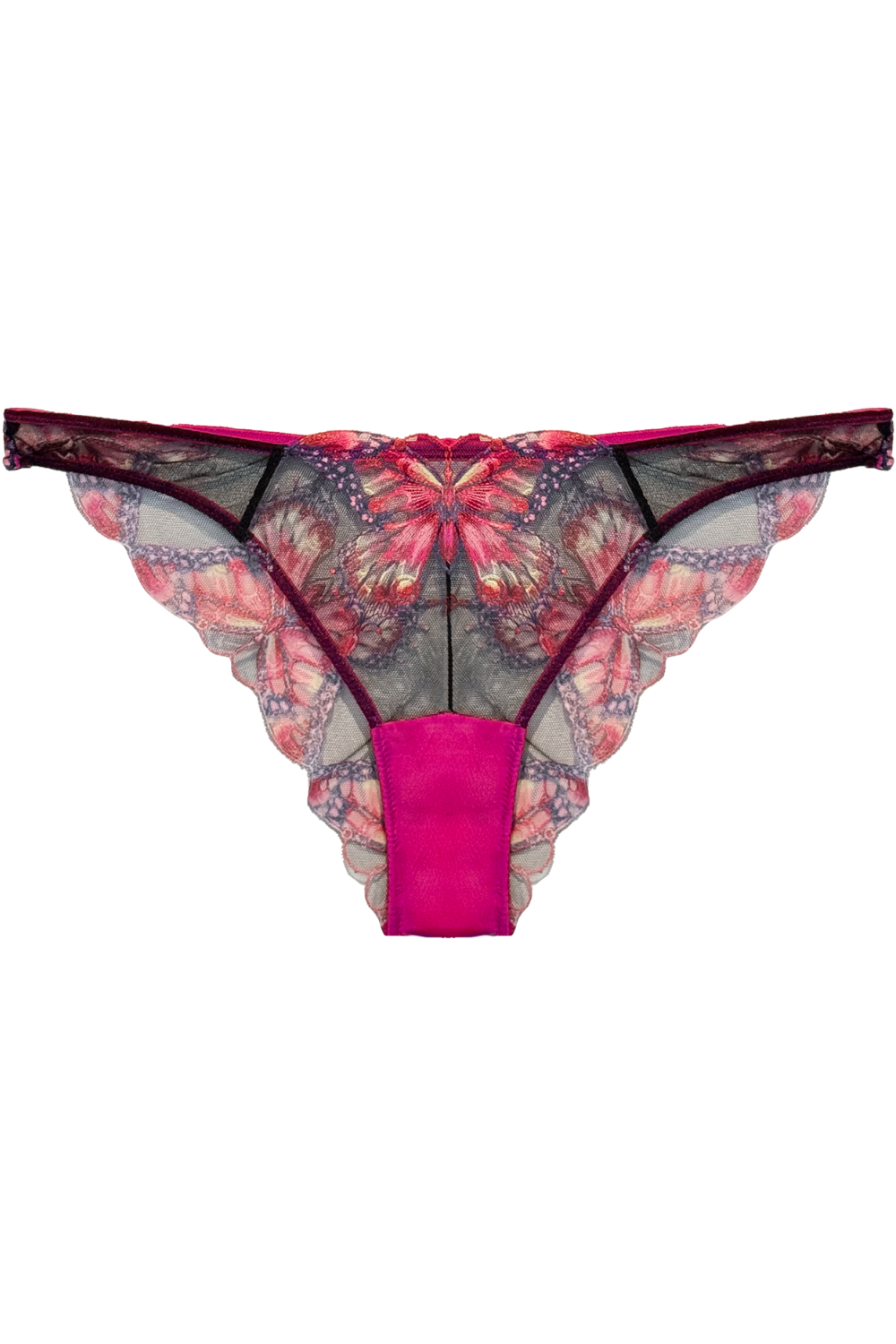 Set hearts aflutter in the Butterfly Embroidery Cheeky Brief, featuring custom butterfly embroidery with a playful scalloped edge. Back keyhole detail and flattering cheeky cut. Complete this sweet set with the matching Butterfly Embroidery Balconette Bra & Garter Belt.