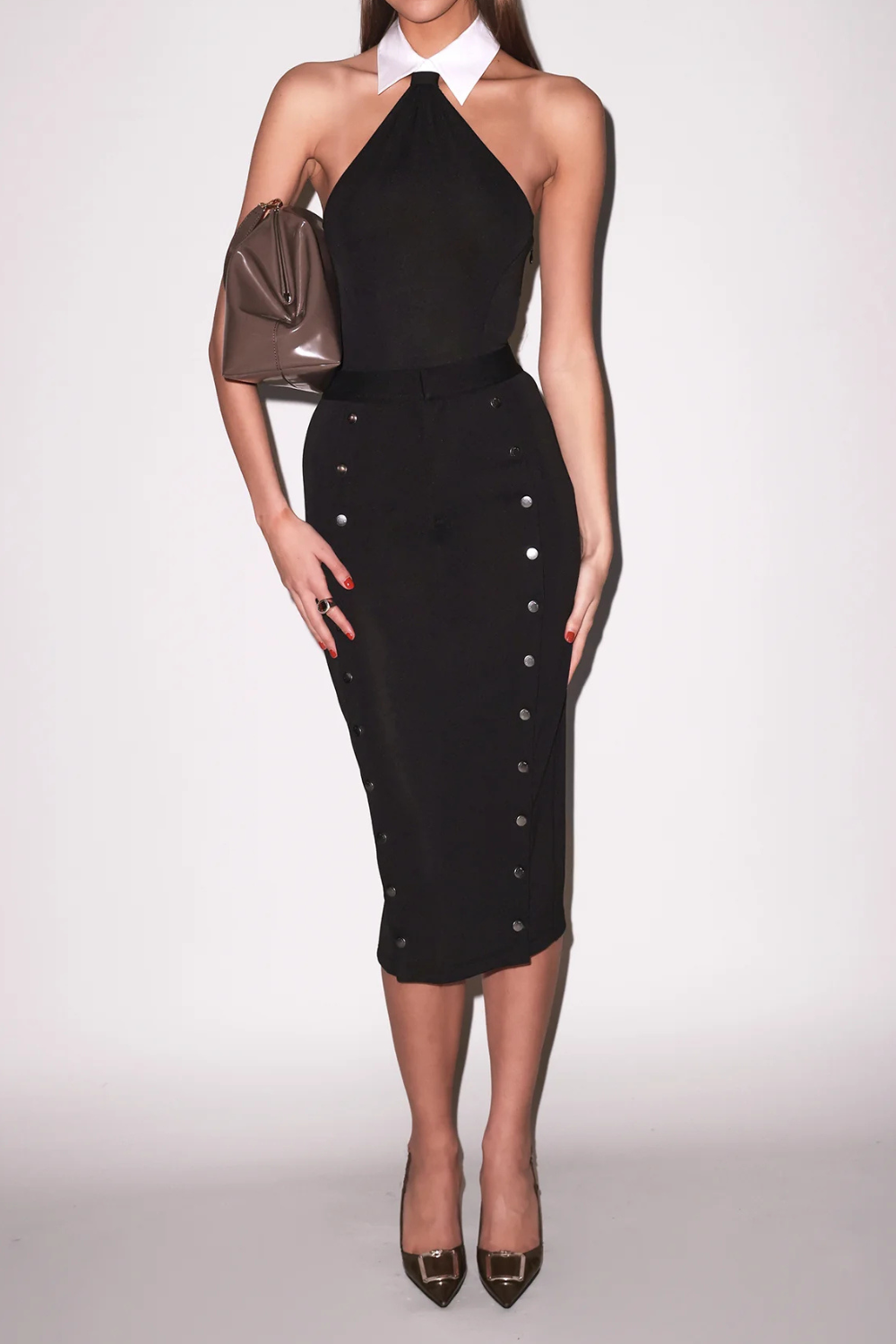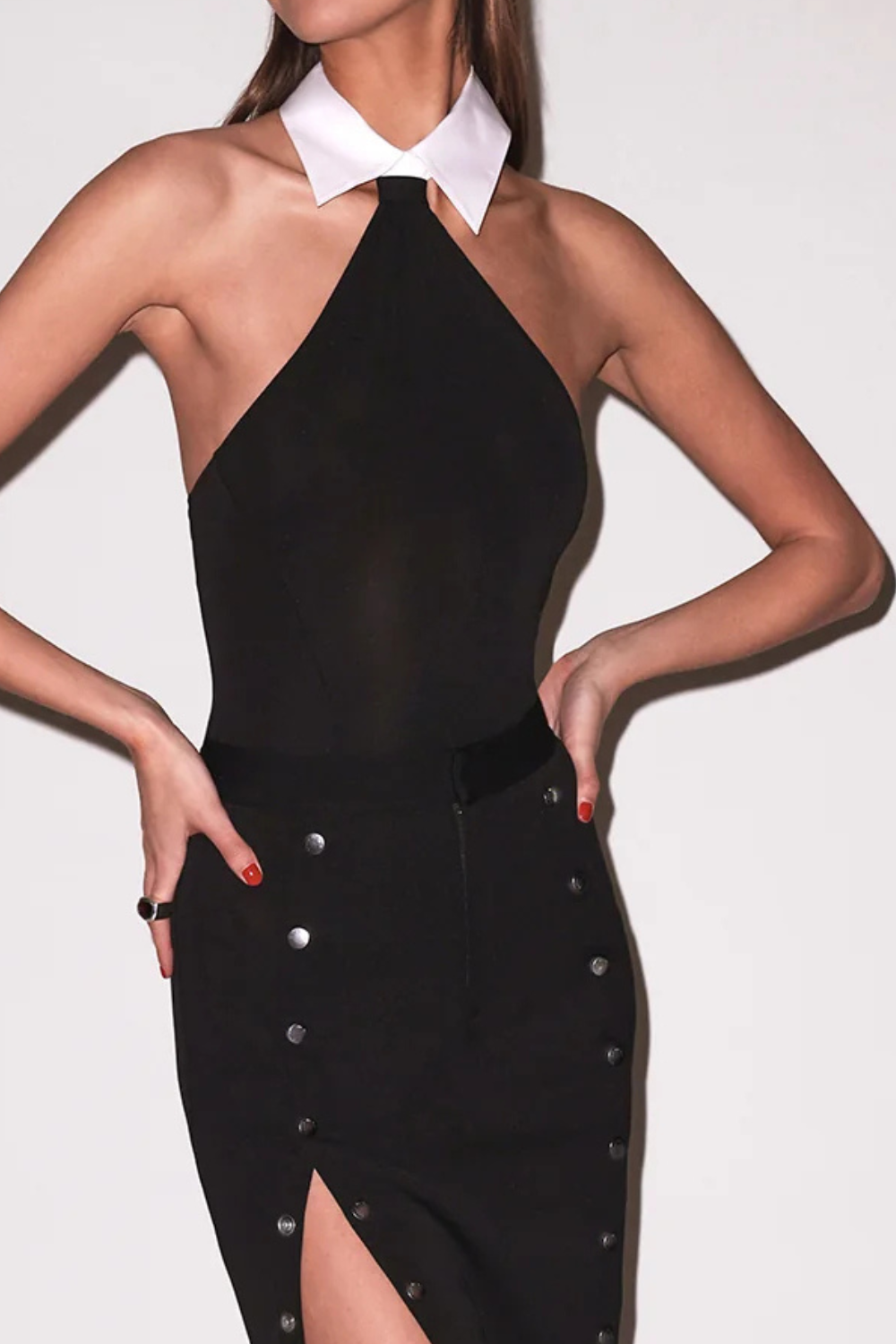 The Hannah Black Bodysuit by Fleur du Mal combines sleek matte jersey with a refined poplin collar and necktie detail for a sophisticated silhouette. Perfect for layering or as a striking statement on its own.