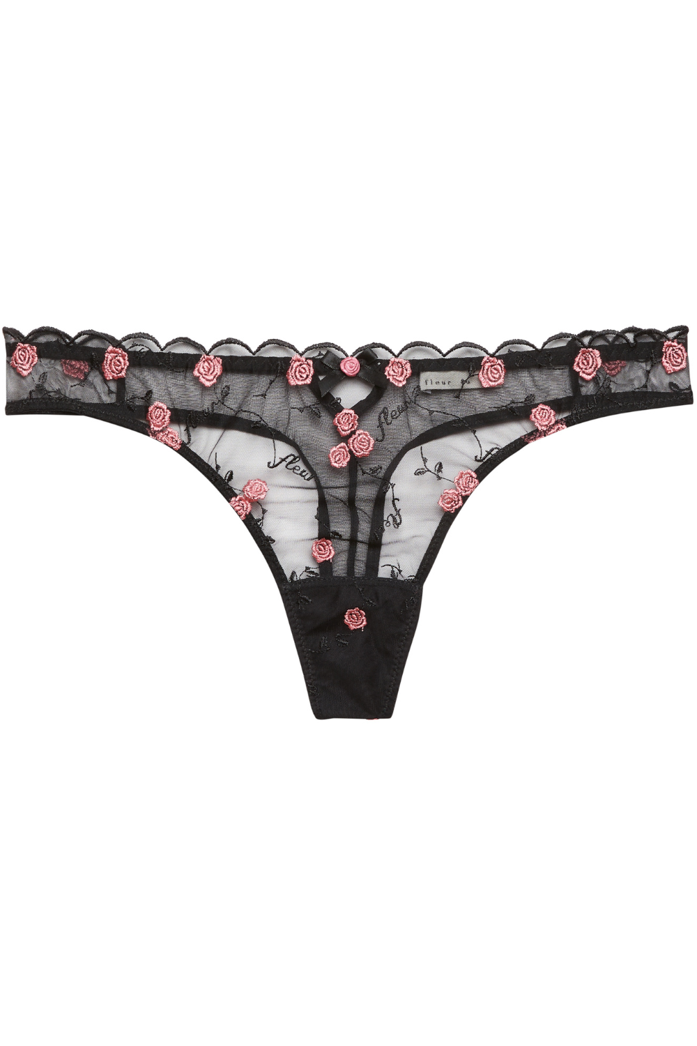 Adorned with custom rose embroidery and delicate Fleur logo script, this thong features a charming rosette bow and a scalloped lace legline that flatters every curve.