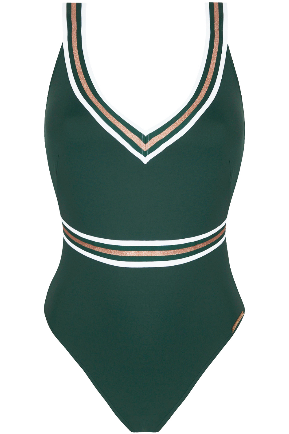 The Lise Charmel Énergie Nautique Crossed Back Swimsuit in green blends sporty elegance with luxury. Crafted from Lycra Sport microfiber, it features a wire-free fit, wide straps, and a deep back neckline with chic graphic accents—ideal for stylish, active summer days.