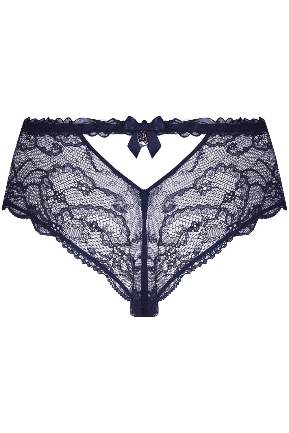 The Soir de Venise Shorty in Navy by Lise Charmel embodies the timeless elegance and sensuality of French couture lingerie. Crafted from luxurious Calais lace, this low-rise shorty delicately reveals the curves with refined allure.