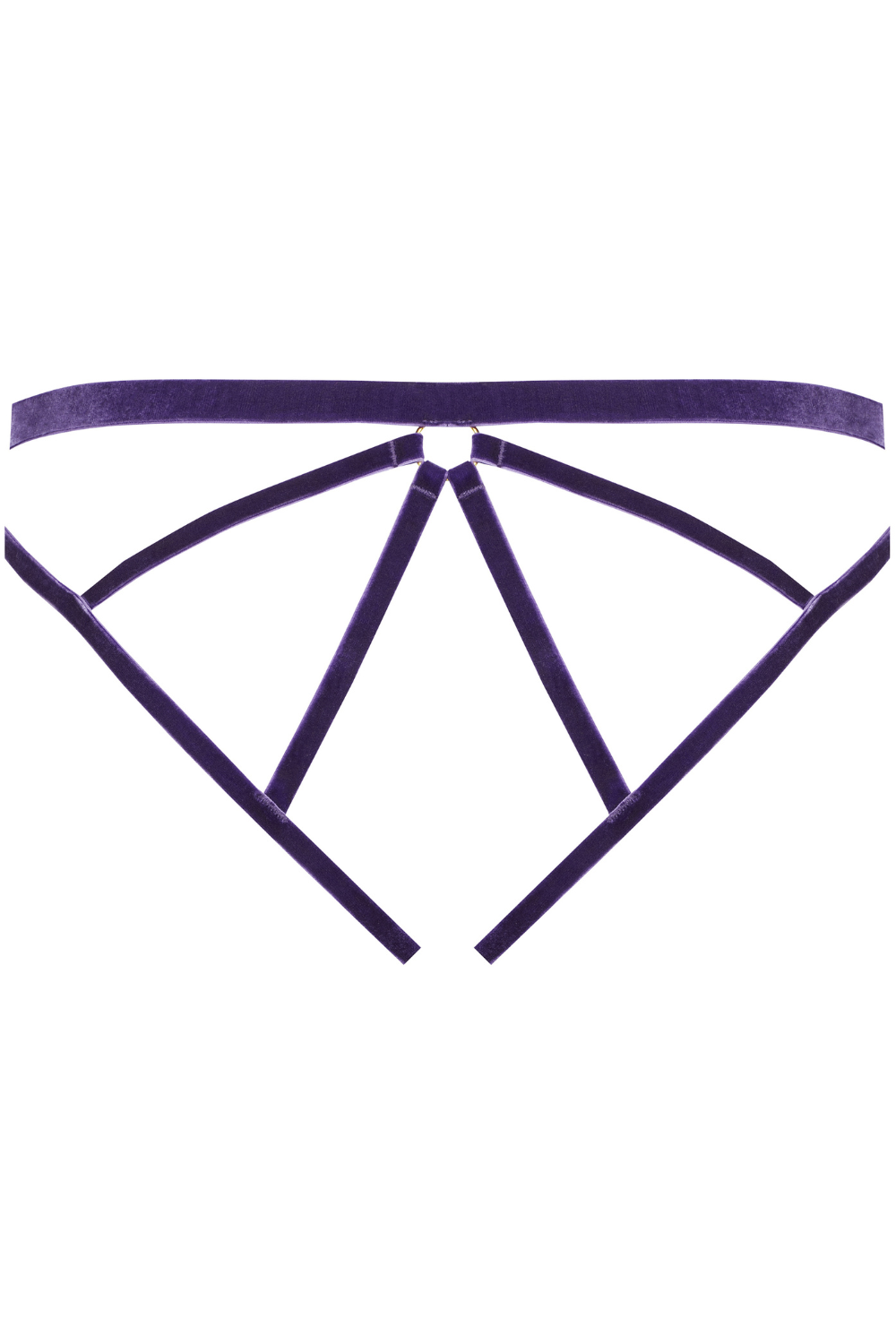 The Maison Close Les Fétiches Velvet Open Brief in purple seduces in soft-touch velvet. Crotchless and strappy, it’s enhanced with golden hardware and the Maison Close engraved tassel for a refined, enigmatic allure. Pair with the matching purple harness to create a strappy ouvert bodysuit.