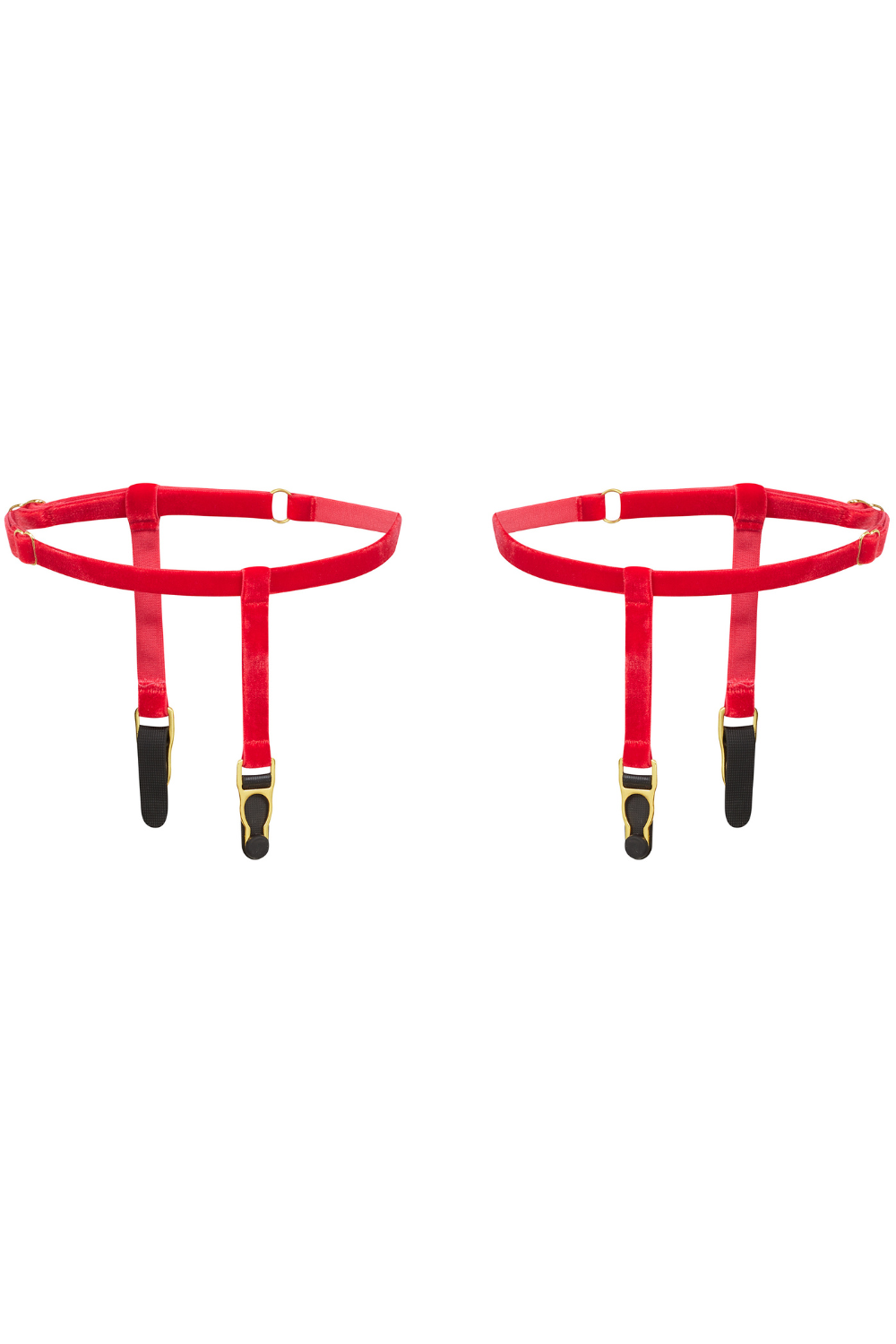 Maison Close Les Fétiches Velvet Leg Garters in red ignite passion. Crafted from soft velvet with golden hardware and an adjustable fit for bold sensuality.
