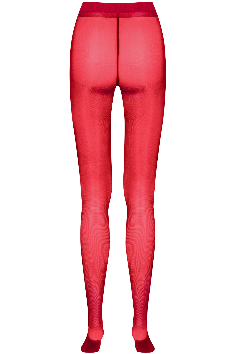Luxurious Obsession semi-opaque red tights crafted to elongate and illuminate. Refined sheen, high-waisted shaping band, cotton gusset, reinforced construction. Timeless elegance for day or night.