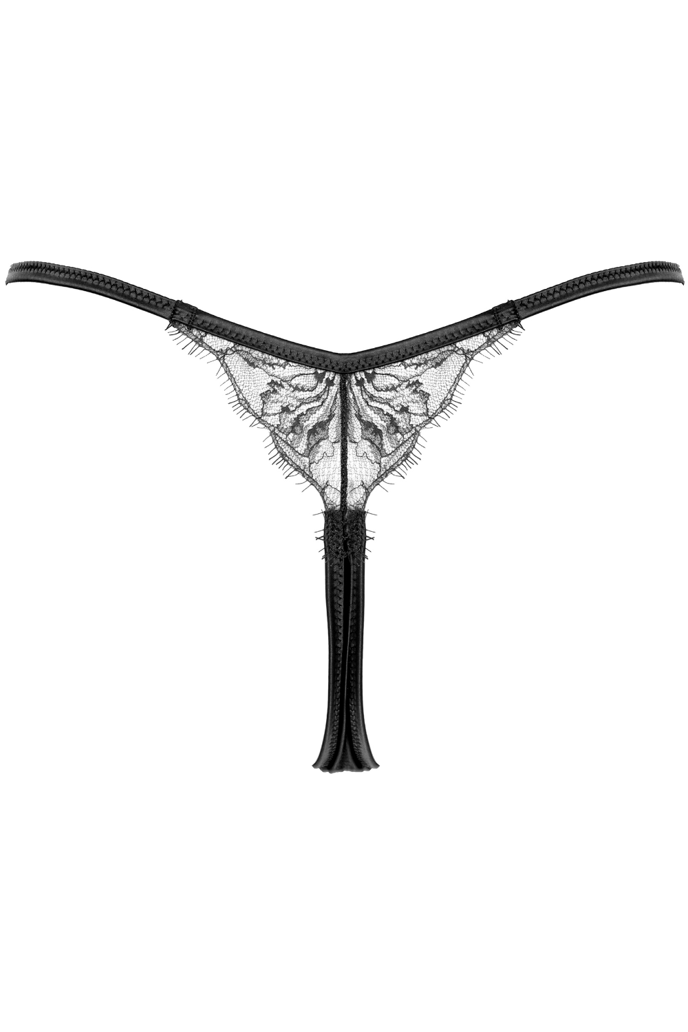 Black Pearl Mini Thong in Italian floral lace with eyelash trim, satin, and thin straps. Luxurious, comfortable, and artfully crafted for a refined look.