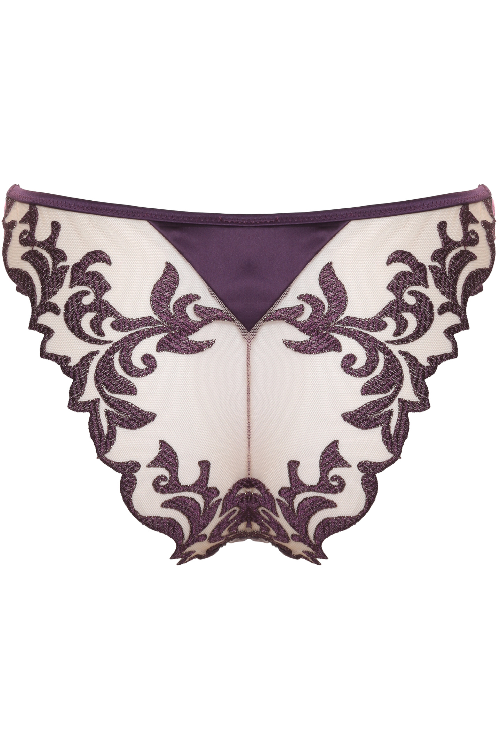 The Venus Brief in violet pairs intricate embroidered mesh with a satin front and trims. Flattering brief cut and cotton gusset ensure comfort and sophistication, making it a refined and sensual lingerie essential.