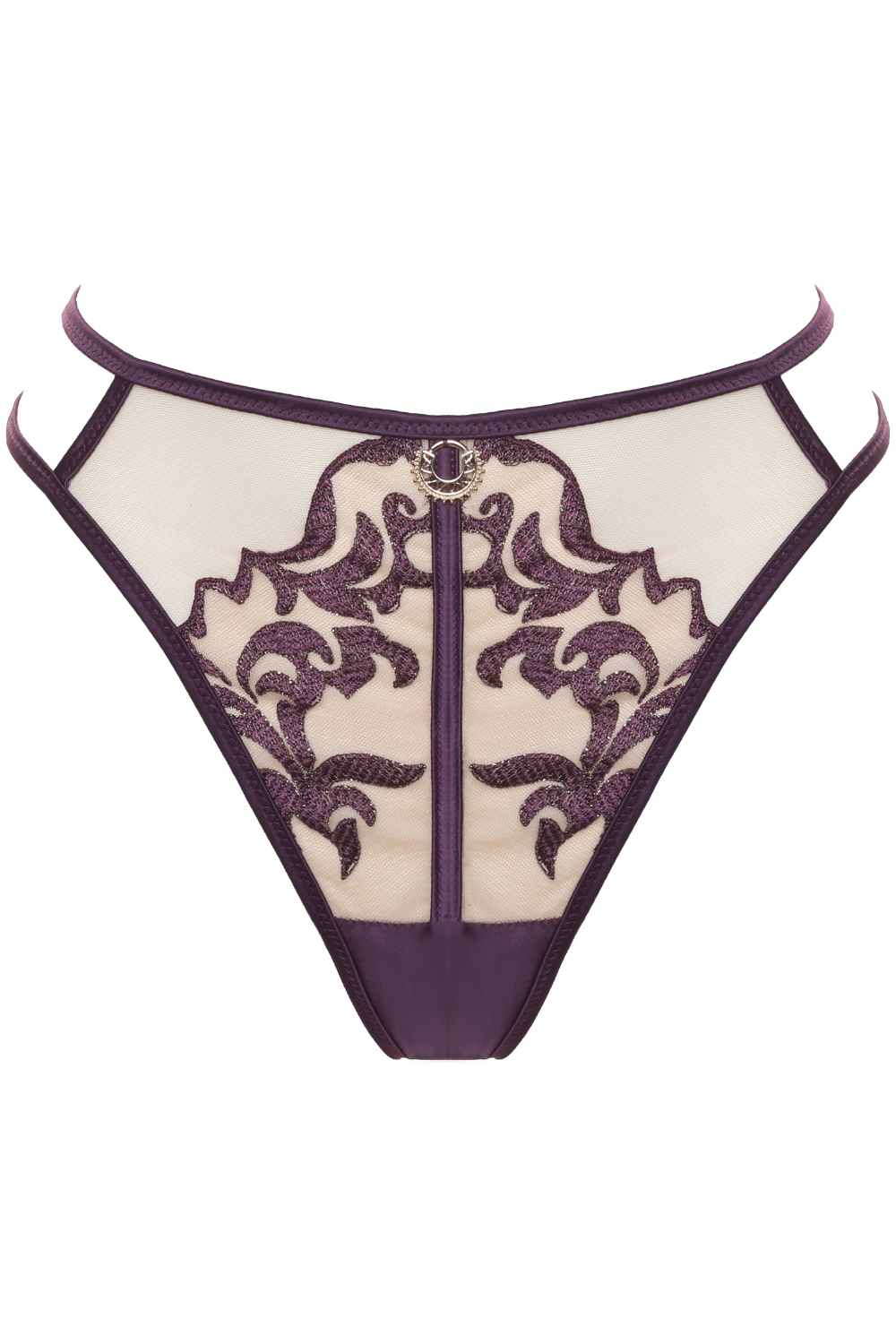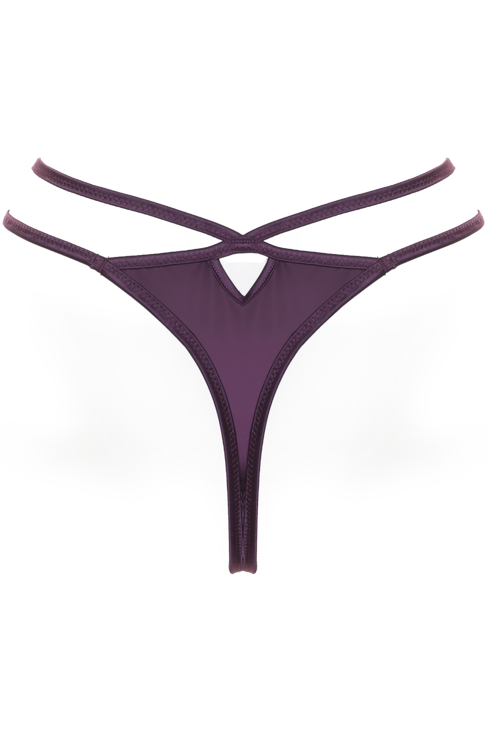 The Venus Thong in violet pairs delicate embroidered mesh with soft satin straps and back. Flattering thong cut and a cotton gusset provide comfort, creating a seductive, elegant lingerie essential.