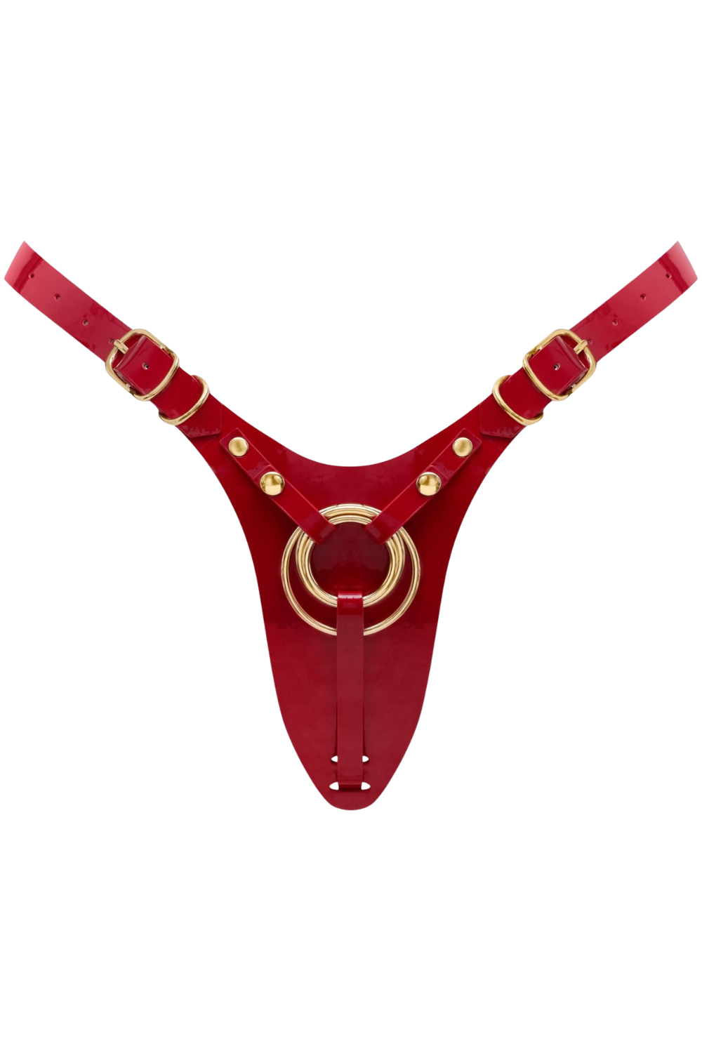 Crafted from high-shine red leatherette, this harness transforms the classic thong silhouette into a striking piece of wearable couture. Its lustrous patent finish radiates energy and power, elevating every movement with unapologetic glamour.
